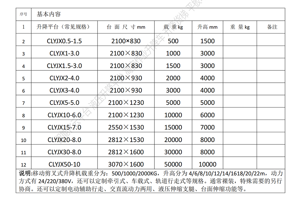 根据使用要求,可配置附属装置,进行任意组合,如:增加智能化管理系统、安全防 护装置、电器互锁装置、红外感应装置、平层防坠装置、称重装置、桥箱、台面翻转、 台面旋转、轨道行走等多种工作形式和动力形式等。